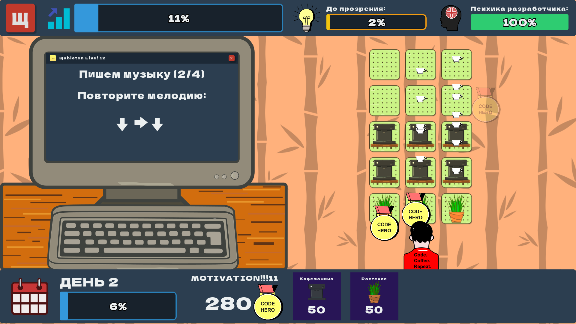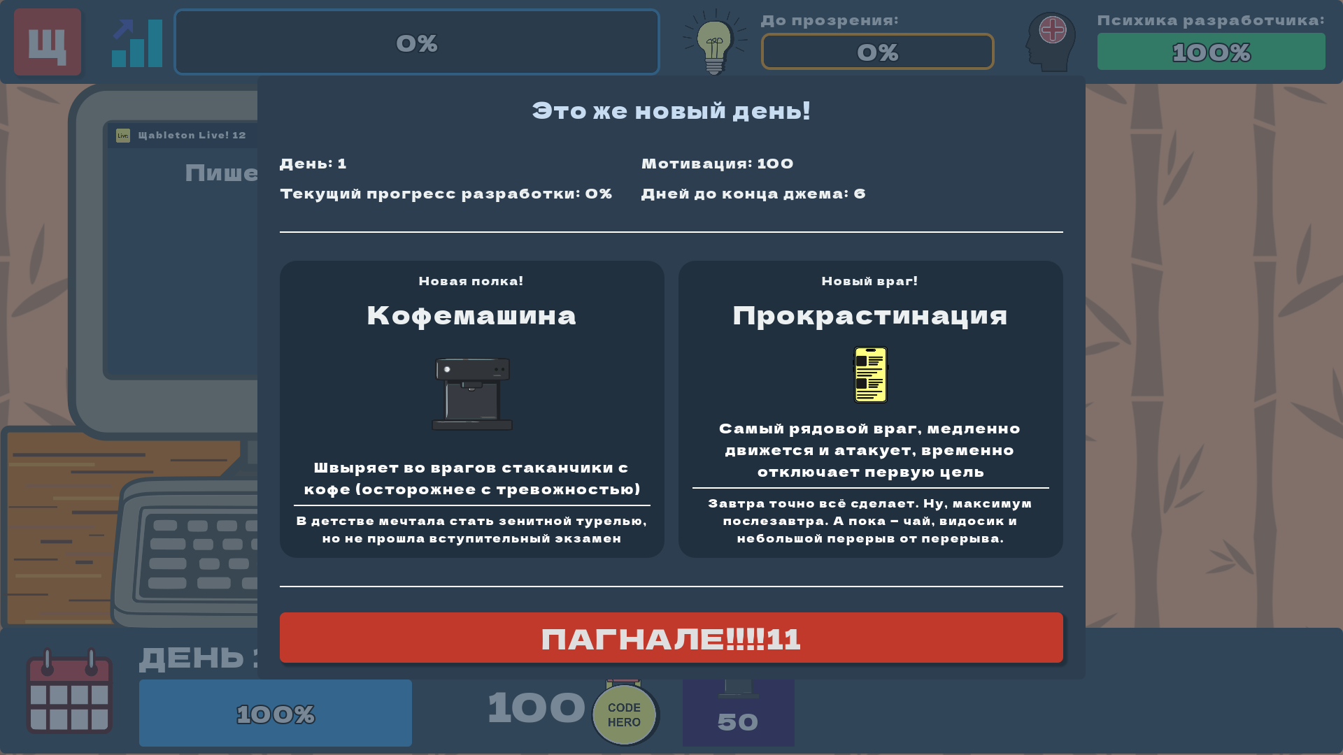 Это игра о том, как бедный инди-разработчик пытается выжить на гейм-джеме и успеть выпустить свою игру 💻