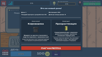 Игра состоит из двух половинок (буквально). Справа у нас Tower Defense, прямо как в Plants vs. Zombies - ставим башенки и защищаемся от врагов. Слева - мини-игры (целых две!) по "разработке игры" на реакцию и внимательность. Вам придется как-то балансировать между этими двумя составляющими. Цель - довести разработку до конца, уложиться в 7 игровых дней и не отъехать в дурку))